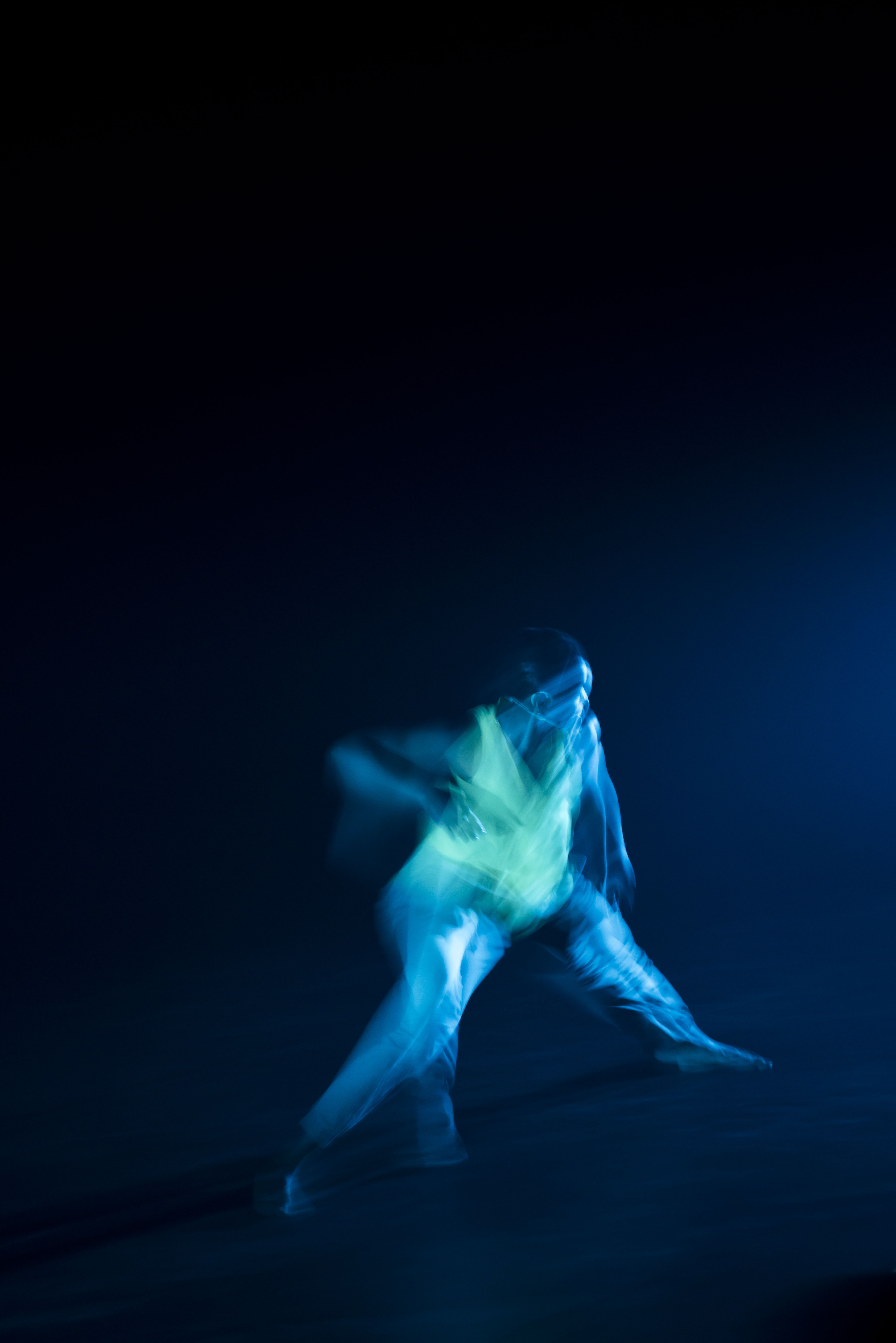 Movement inside a controlled frame. The subject is in motion — running, turning, falling — but the composition holds a rigid structural grid. The tension between the kinetic subject and the silent architecture of the image is the entire point. Shutter speed becomes a directorial tool: not to freeze, but to negotiate how much blur the frame will tolerate before the structure collapses.